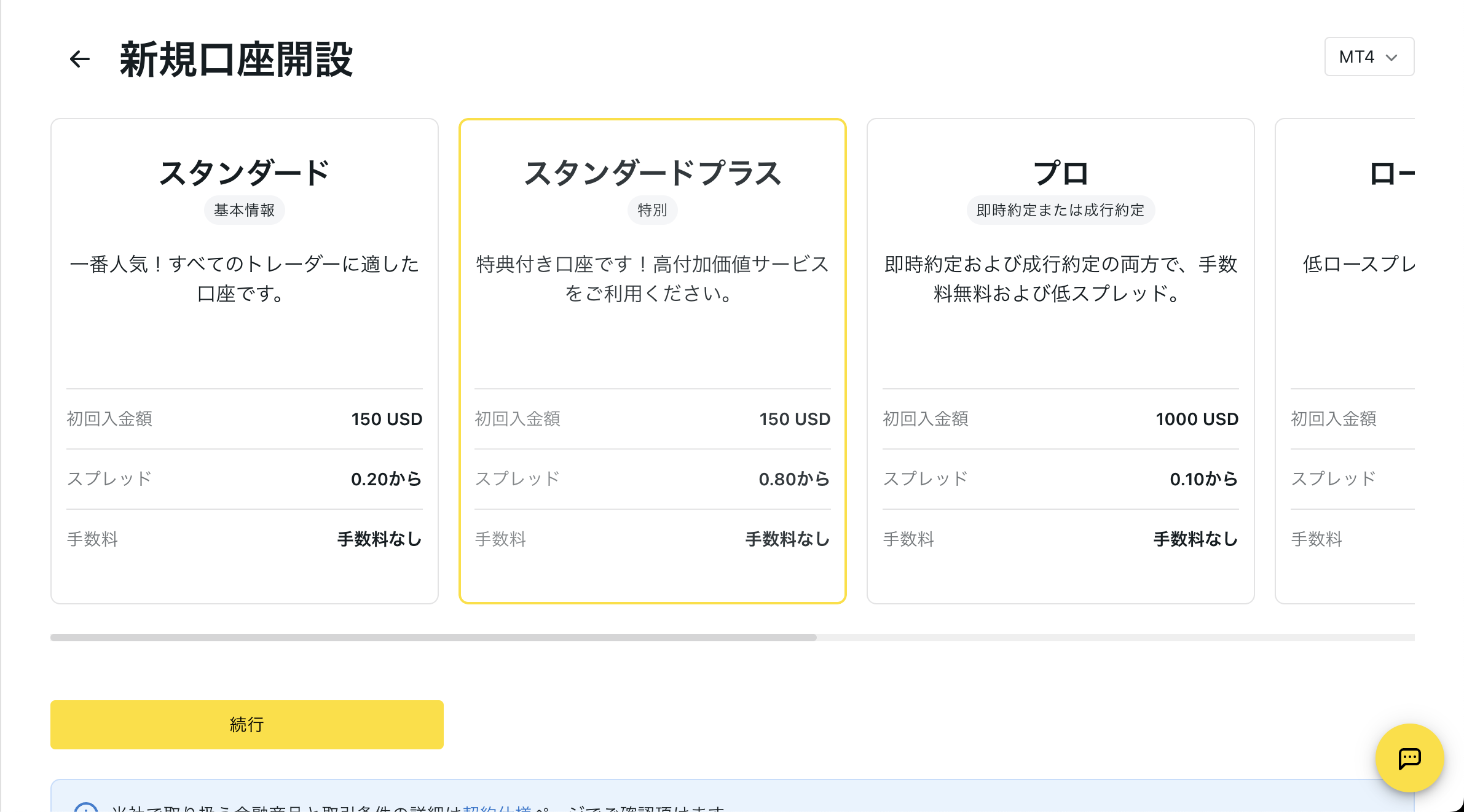 「MT4」と「JPY」、「レバレッジ,1:1000」を選択します。
